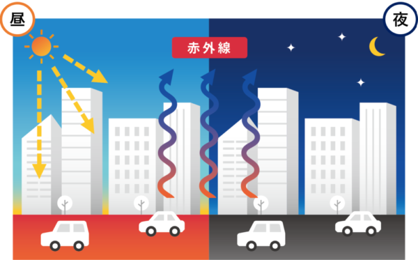 テクノロジー 2023.04.01 放射冷却現象の原理を解説します 末光 真大(CEO 兼 CTO) 放射冷却素材「SPACECOOL(スペースクール)」は、自然界に存在する放射冷却現象を応用した技術です。 あまり聞き馴染みが無い言葉かもしれませんが、実は私たちの身近に起こっている自然現象の1つです。 冬のよく晴れた日の翌朝、車のフロントガラスが凍っていたり、草木に霜が降りていたりするのも、放射冷却によって生じている現象です。 放射冷却現象とは 放射冷却現象は、地表の熱が赤外線という光に変わって宇宙空間へ放射され、周囲の温度が低下する現象のことです。 厳密には地表からの放射は常に発生していますが、昼間は太陽光からの熱エネルギーが膨大なため冷えることはなく、太陽光が無くなった夜に初めて冷え込みやすくなります。 つまり、熱収支の関係が、昼間は「太陽光からの入熱>地表からの出熱」なのですが、 夜間は「太陽光からの入熱<地表からの出熱」で不等号が逆になるんですね。 余談ですが、「熱が宇宙空間に捨てられると宇宙が暖まってしまうのでは?」という声もたまに頂くのですが心配ありません。 宇宙は-270℃という極寒かつ、今も広がり続けている広大無辺な空間ですので、地球上の熱が移動しても影響はないのです。 昼間:太陽光の入熱>赤外線による出熱=暖まる 夜間:太陽光の入熱<赤外線による出熱=冷える この現象を応用した技術が、我々の放射冷却素材「SPACECOOL」です。 一般的な素材は、先ほどの説明のとおり、昼間は太陽光からの入熱量が多いため冷えることはありません。しかしSPACECOOLは、太陽光をほとんど反射することで入熱量を抑えたうえで、SPACECOOLに伝わった熱を赤外線に変換して宇宙空間へ放射することで「太陽光からの入熱<SPACECOOLからの出熱」を実現しているため、太陽光が当たる日中でさえもゼロエネルギー(=電力を使わず)で冷やすことができるのです。 おまけ ちなみに、放射冷却現象によって地表から放射される赤外線と、SPACECOOLが放射する赤外線は特性が異なります。 地表面からの赤外線は、実は宇宙空間まで抜けていかず、大気中のH₂Oや温室効果ガスに吸収・反射され、結局地表面に留まってしまうことが多いんです。 これが、地球温暖化の原因です。 一方で、SPACECOOLが放射する赤外線は、大気に邪魔されず宇宙空間まで抜けていきやすいため、昼間でもゼロエネルギーで冷却することが可能です。 なぜそんなことができるのか? その秘密は、SPACECOOLの技術ページで解説していますのでぜひチェックしてみてください。 SPACECOOLの技術ページ…https://spacecool.jp/technology/